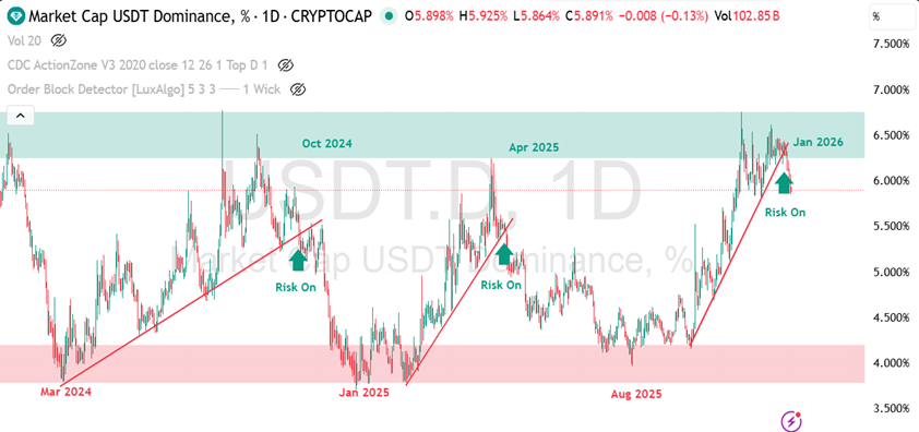 ซึ่งปัจจุบัน USDT Dominance ปรับตัวเป็นแนวโน้มขาลง บรรยากาศตลาดเริ่มกลับมาเป็น Risk-on มากขึ้น