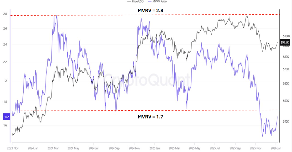 แม้ราคาปัจจุบันยังอยู่แถว $93,000 แต่ค่า MVRV