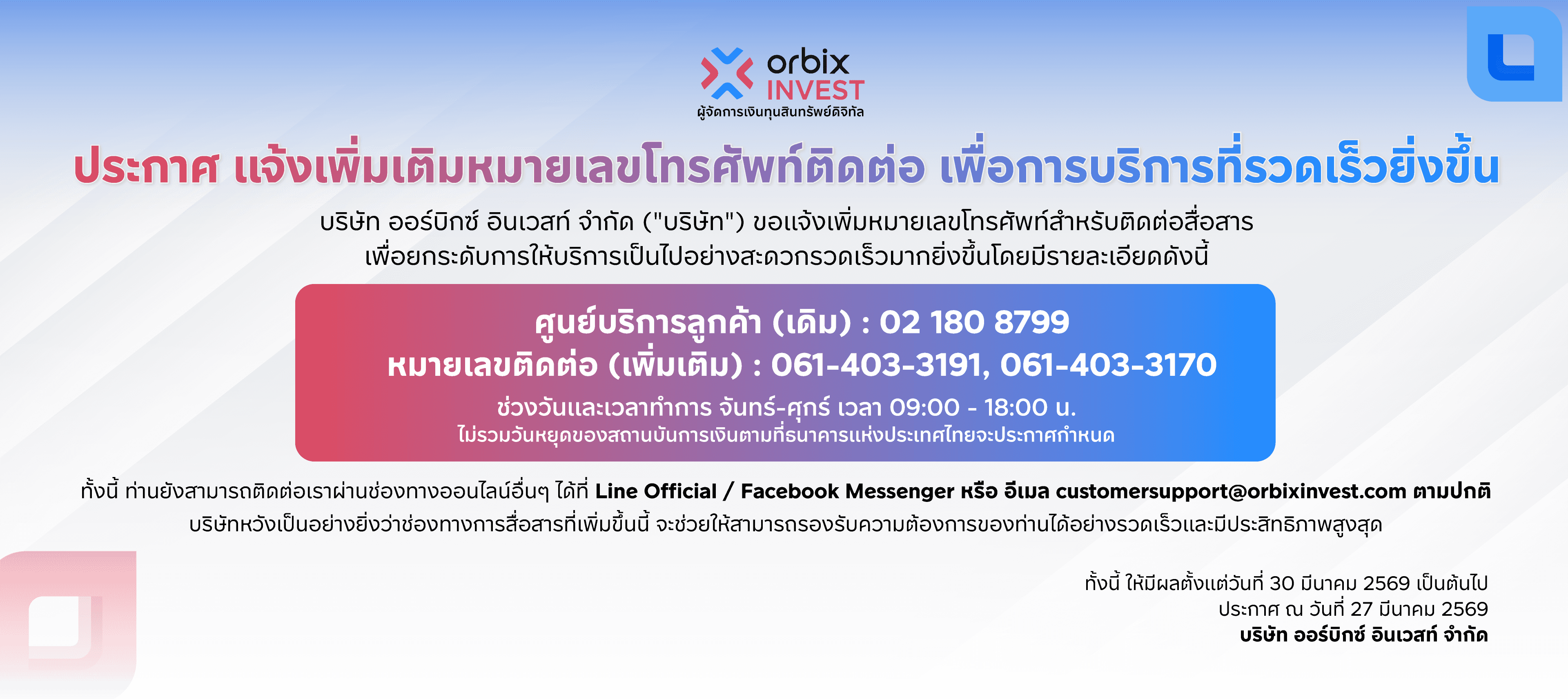 ทั้งนี้ ท่านยังสามารถติดต่อเราผ่านช่องทางออนไลน์อื่นๆ ได้ที่ Line Official / Facebook Messenger หรือ อีเมล customersupport@orbixinvest.com ตามปกติ