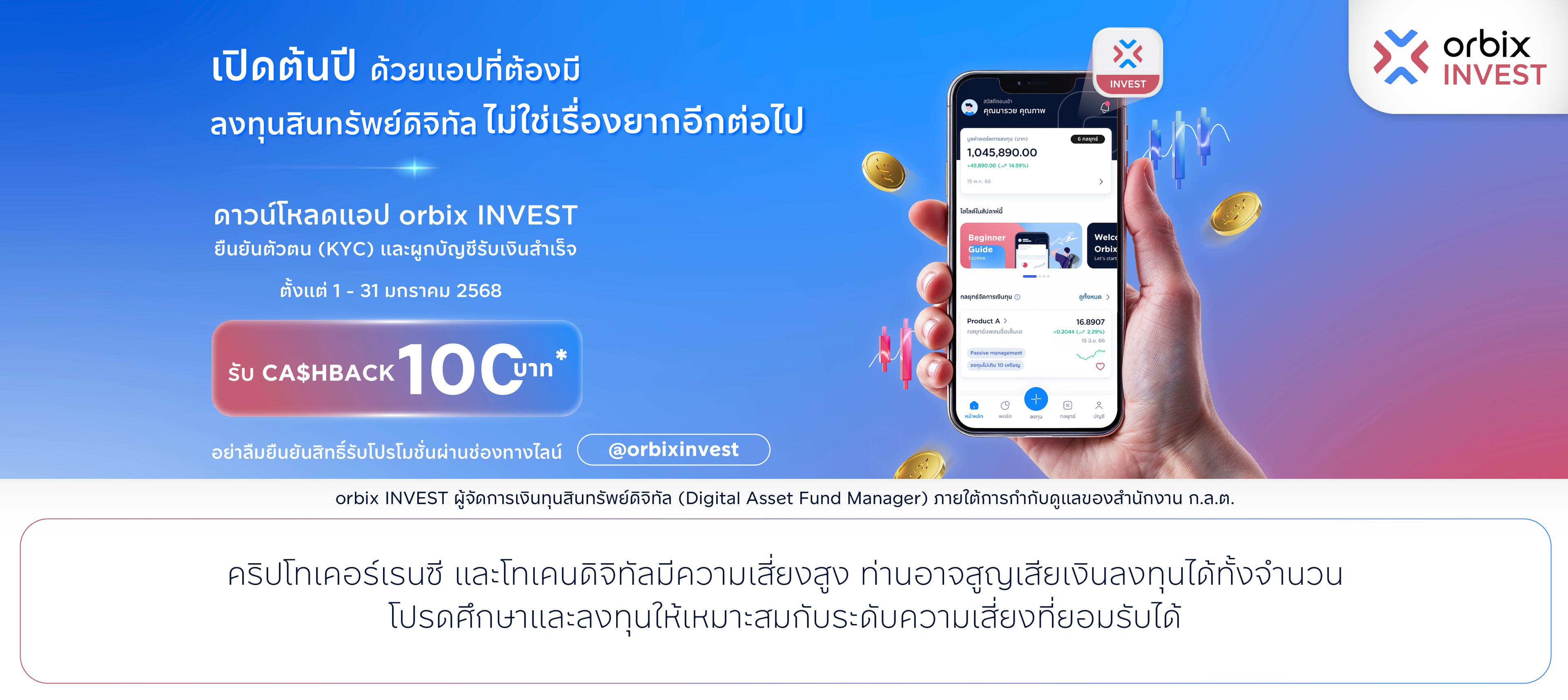 1.ลูกค้าใหม่เปิดบัญชี orbix INVEST และยืนยันตัวตน (KYC) และผูกบัญชีรับเงินสำเร็จ ตั้งแต่วันที่1 – 31 มกราคม 2568 รับ cashback มูลค่า 100 บาท จำนวน 1,000 สิทธิ์