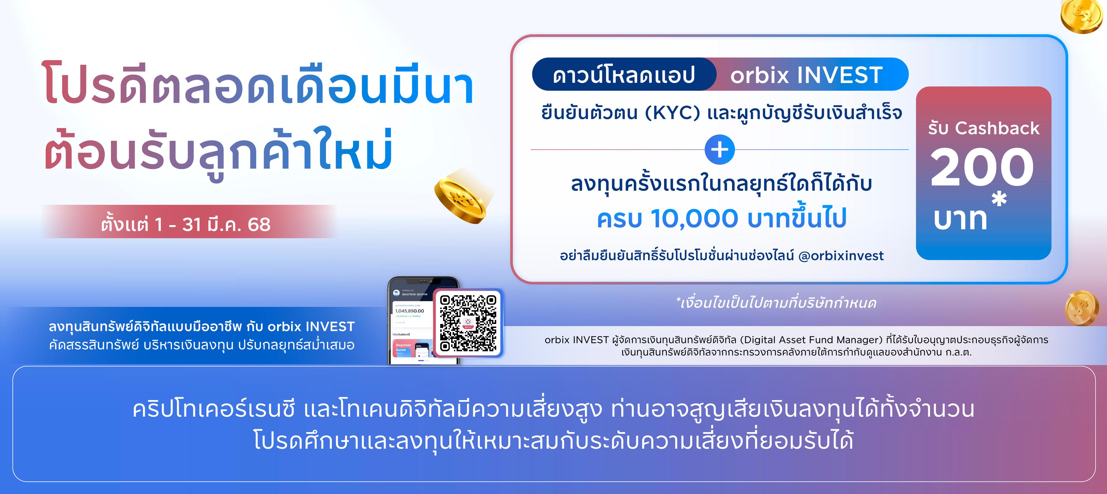 🎊orbix INVEST ต้อนรับลูกค้าใหม่เดือนมีนาคม เพียงดาวน์โหลดแอป orbix INVEST ยืนยันตัวตน (KYC) ผูกบัญชีรับเงินสำเร็จ พร้อมเริ่มต้นลงทุนครั้งแรก ครบตั้งแต่ 10,000 บาท ขึ้นไป รับ Cashback 200 บาท*