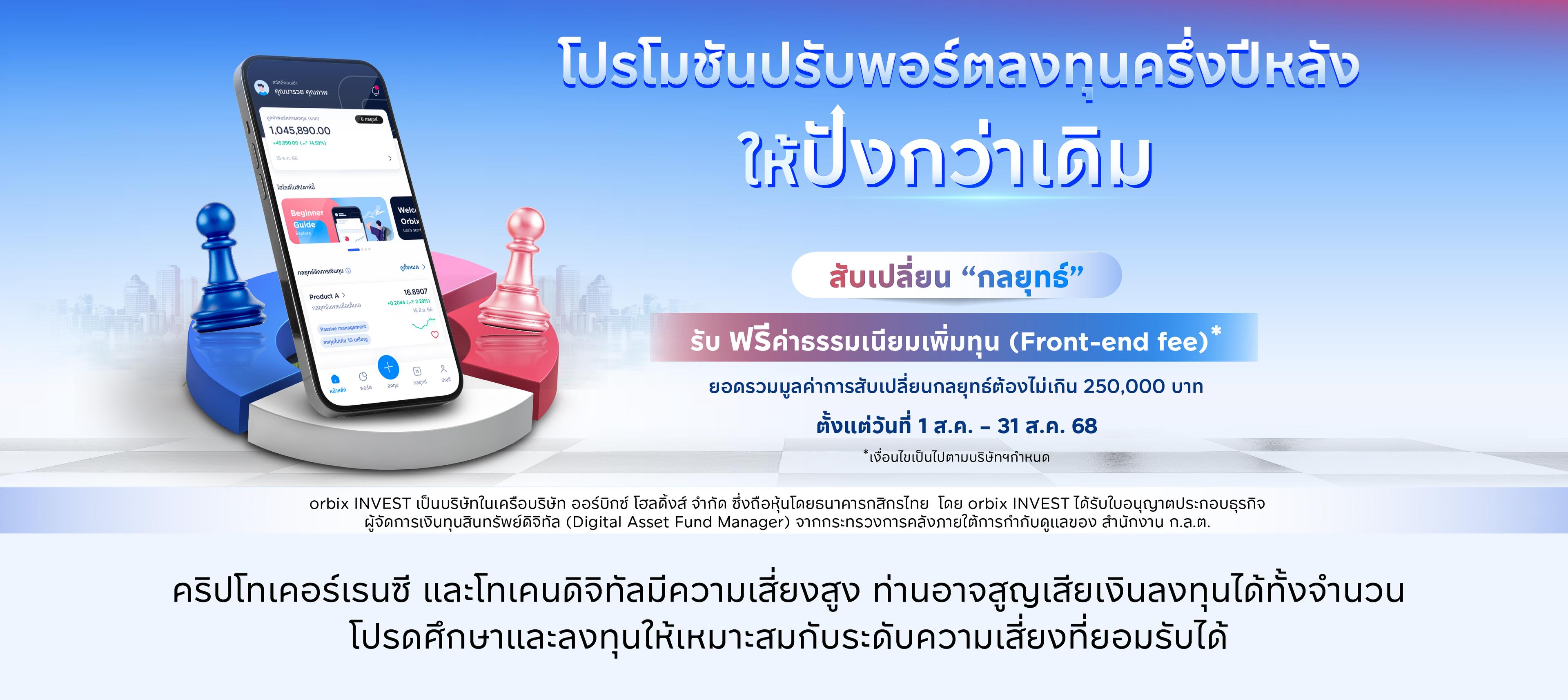 สำหรับลูกค้าที่ลงทุนกับ orbix INVEST และต้องการสับเปลี่ยน “กลยุทธ์” ที่ถือครองอยู่ไปยังกลยุทธ์ อื่นๆ ไม่ต้องเสียค่าธรรมเนียมเพิ่มทุน (Front-end fee)* โดยยอดรวมมูลค่าการสับเปลี่ยนกลยุทธ์ต้องไม่เกิน 250,000 บาท เริ่มตั้งแต่วันที่ 1-31 สิงหาคม 2568
